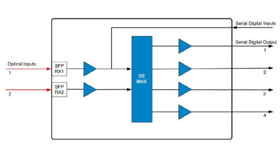 Singlemode Quad Channel 3G/SDI Fibre Optic Demultiplexing Receiver Module, Auto-Sensing and reclocking for SDI, HD/SDI and 3G/SDI